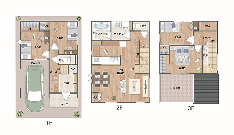 LDKや水回りを2階に配置し、プライバシー面にも配慮。18帖超のLDKには、コミュニケーションが取りやすい、対面式キッチンやリビング階段を採用しています。室内各所に収納付きです◎