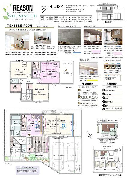 | 建物面積 | 97.7m2~99.01m2 | 土地面積 | 120.29m2~128.31m2 / 私道負担なし |