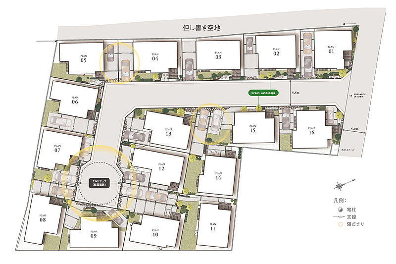 街の入り口からクランクへと誘うアプローチに緑豊かな風景をデザイ...