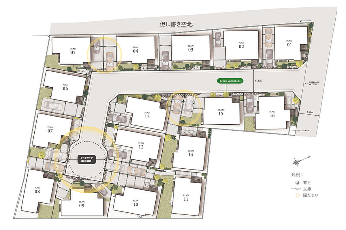 人と車が安全にすれ違える5.5m幅を確保した開発道路沿いには、四季の移ろいを演出する樹種を配合し、歩くたびに緑の潤いを感じられる風景を創出。
