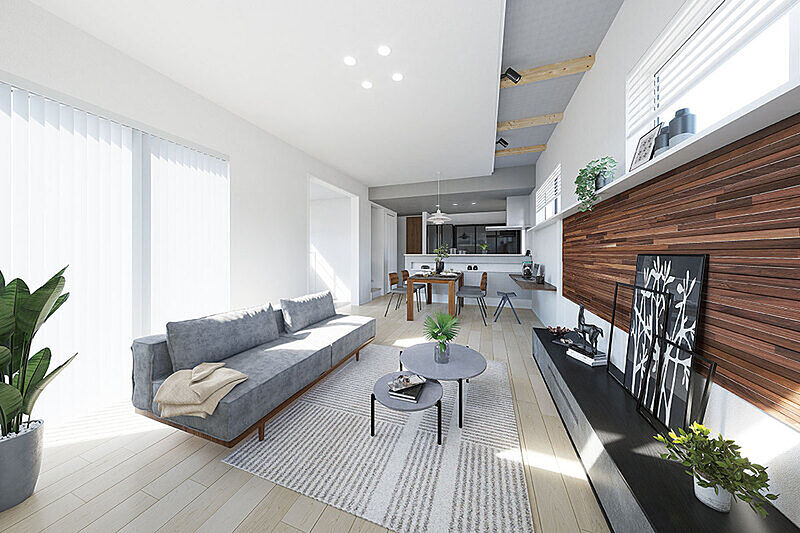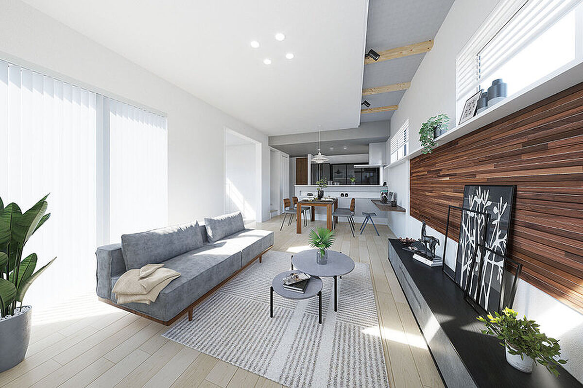 家族がそれぞれに寛ぎながらも、繋がりを感じられる邸別設計の室内空間。化粧梁やアクセントパネルなどをLDKの随所に施し、居心地のよさを追求しました。