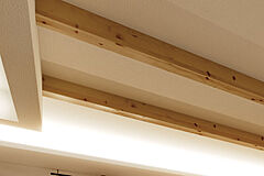 折り下げ天井を施したキッチンに間接照明を設置。照明をつけると美しい陰影を描き出し、化粧梁の影も相まって上品な空間を演出します。※号棟により採用状況が異なります。