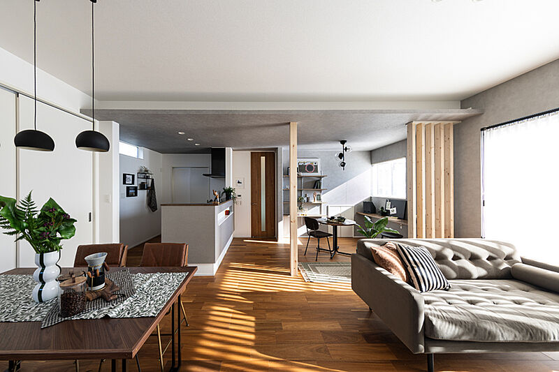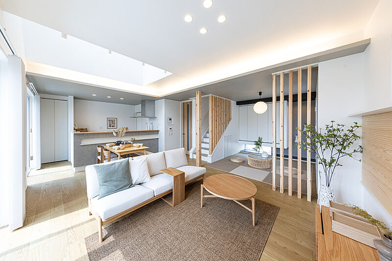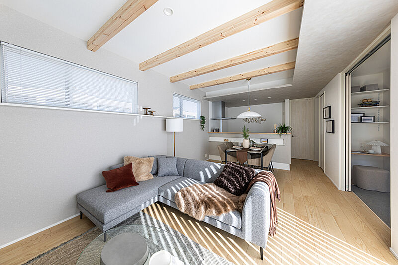 天井の化粧梁と木目調アクセントクロスが空間に立体感を演出。自然素材のような風合いが、やさしい表情と心地よい陰影をリビングに生み出します。
