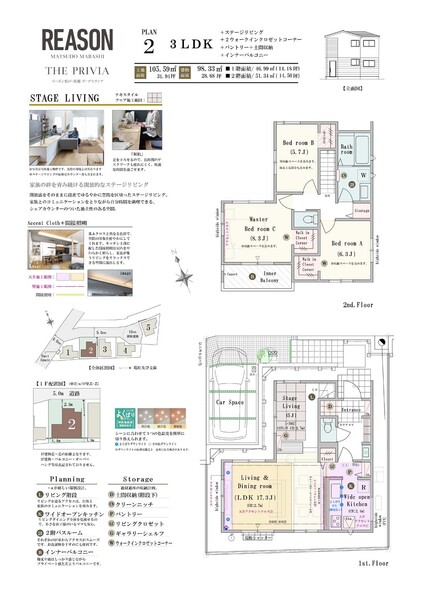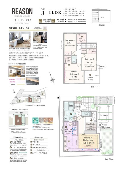 | 建物面積 | 95.12m2~98.33m2 | 土地面積 | 104.74m2~113.39m2 / 私道負担なし |