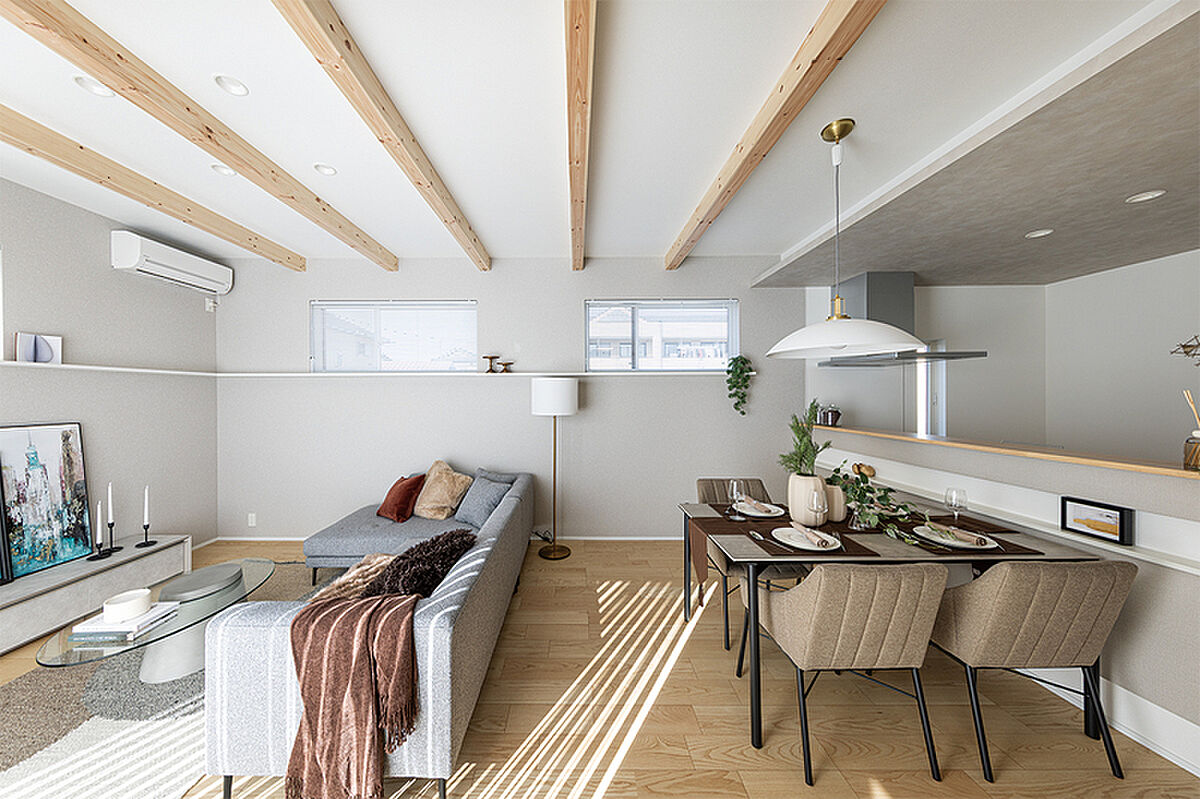 空間にアクセントを加える化粧梁はデザイン性を高め、木のぬくもりに包まれたような心地よさを演出します。