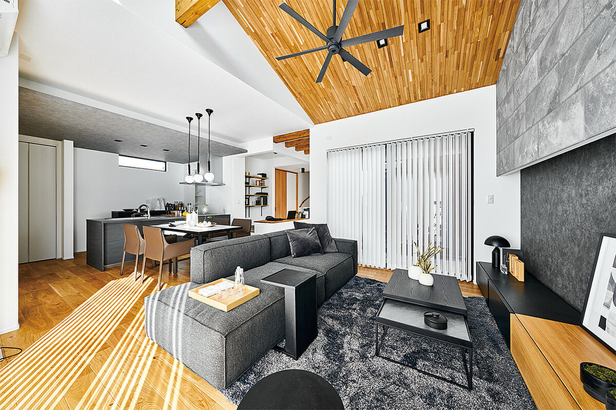 足を踏み入れた瞬間に、開放感が伝わる勾配天井。化粧梁をアクセントとしてあしらい、のびやかな空間の中に豊かな表情を描き出します。
