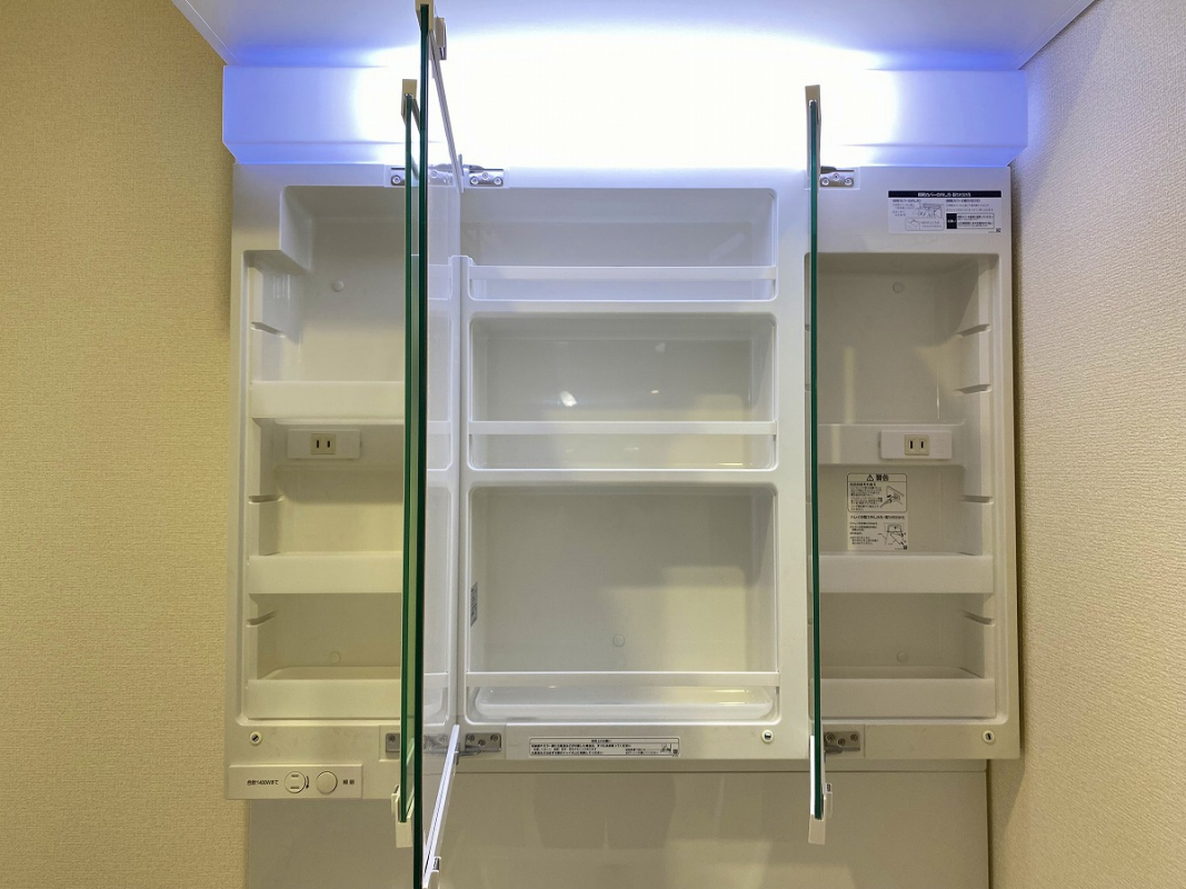 身支度のしやすい、三面鏡&シャワー付きの洗面化粧台を設置。