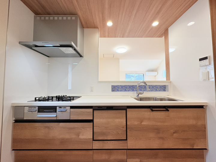 キッチンには、ボタン操作ひとつで油汚れをスッキリ!ビルトインタイプのスマート設計の食器洗浄乾燥機をご用意致しました。