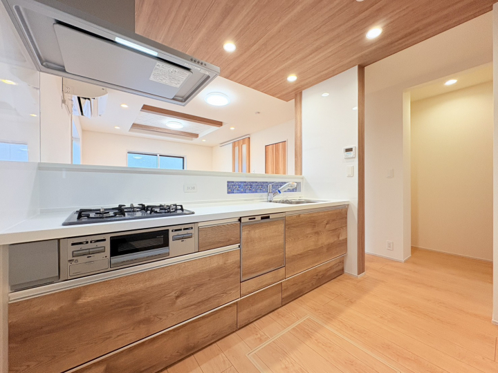 ■キッチンは、食洗器をはじめ、浄水器一体型水栓・三口コンロなど便利な機能が配備されています。キッチンの床にはストック品の収納に便利な床下収納付き。