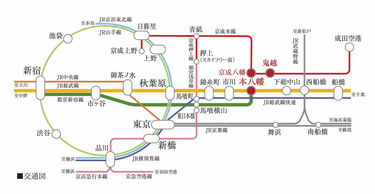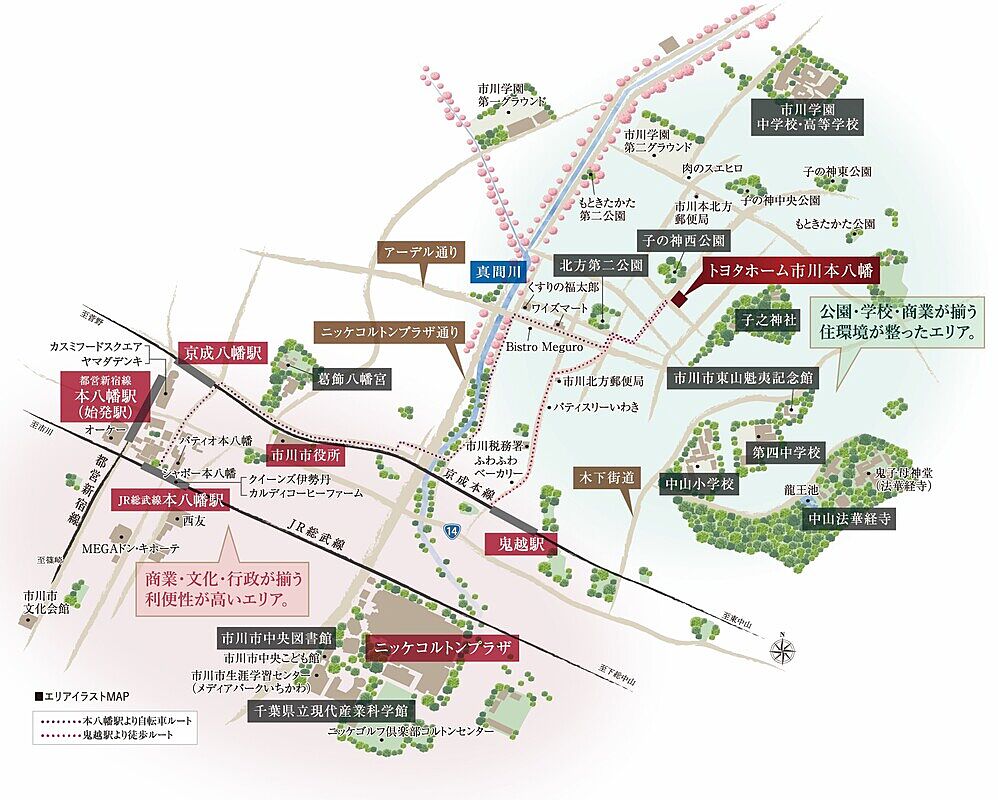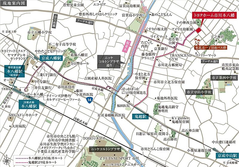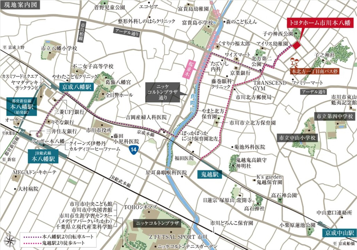 JR総武線「本八幡」駅 バス13分乗車「本北方一丁目」バス停 徒歩2分~3分 JR総武線「本八幡」駅 徒歩25分~26分 都営新宿線「本八幡」駅 徒歩23分 |