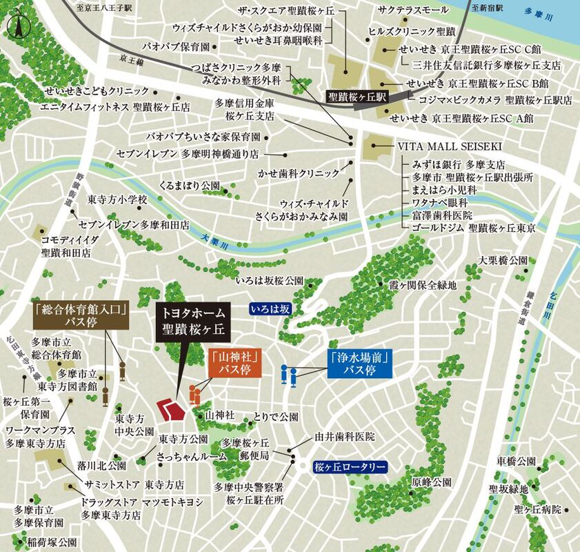 - 京王線「聖蹟桜ヶ丘」駅 「総合体育館入口」バス停へ徒歩4~5分・京王線「聖蹟桜が丘」駅までバス11分 徒歩4分~5分京王線「聖蹟桜ヶ丘」駅 「浄水場前」バス停へ徒歩6~7分・京王線「聖蹟桜ヶ丘」駅までバス7分 徒歩6分~7分