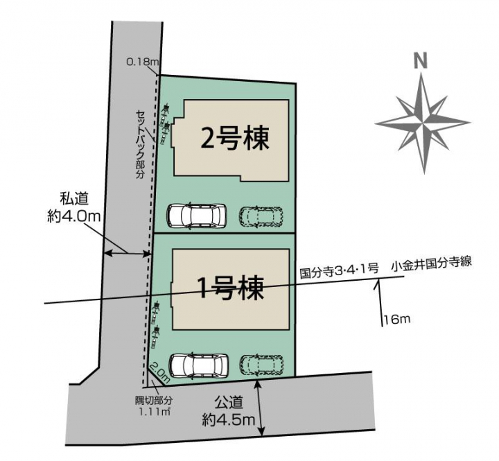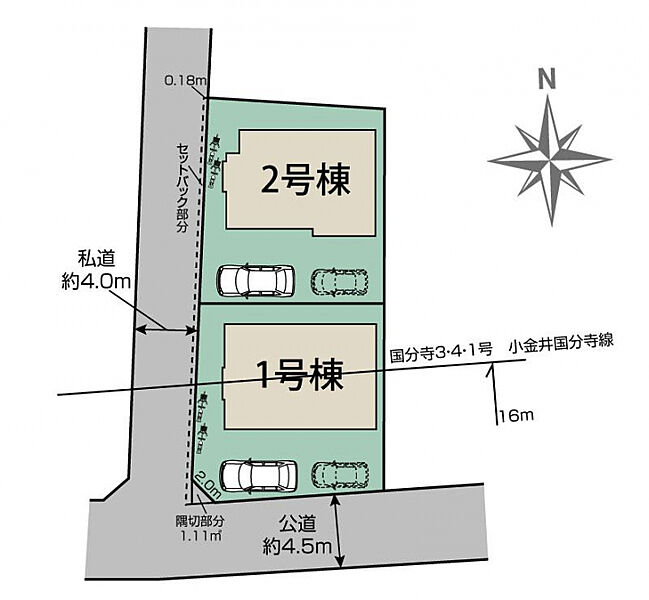 【接道】南4.5m公道、西4.0m私道 【設備】公営水道、東京電力、都市ガス、本下水 【その他法令】第一種高度地区、22条区域、文化財保護法、計画道路3,4,1号小金井・国分寺線 【備考】太陽光発電システムについてはリース契約になります。リース契約期間は10年間、毎月のサービス料は1号棟0円、2号棟0円(税込)となります。期間終了後は無償譲渡されます。※詳細は営業担当にお問い合わせください。(年齢制限有) 【その他持分】【セットバック部分持分】2.28m<sup>2</sup>×1/1(1号棟)【セットバック部分持分】2.27m<sup>2</sup>×1/1(2号棟) |