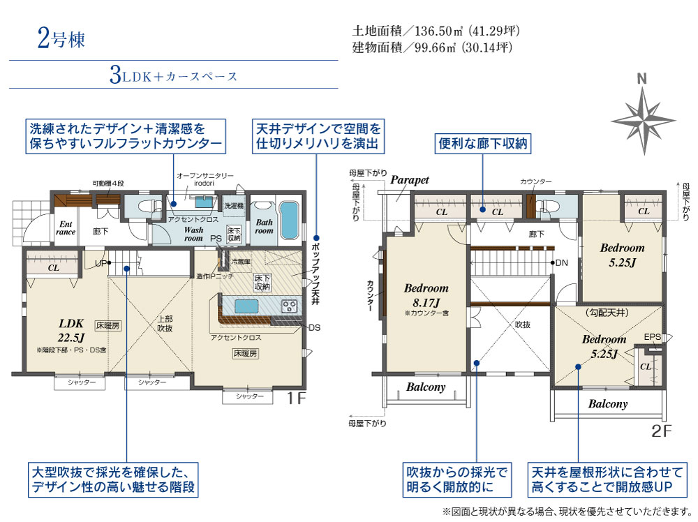 | 建物面積 | 99.66m2(約30.14坪)~105.43m2(約31.89坪) | 土地面積 | 136.50m2(約41.29坪)~138.91m2(約42.02坪) |