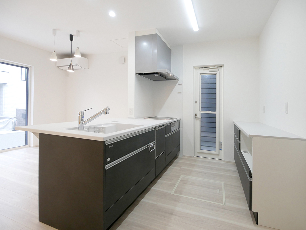 フルフラットのキッチンでスッキリとした印...