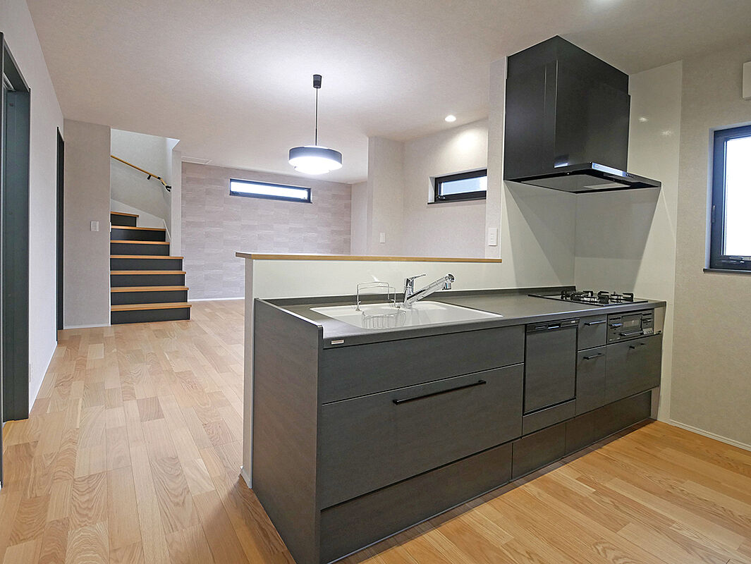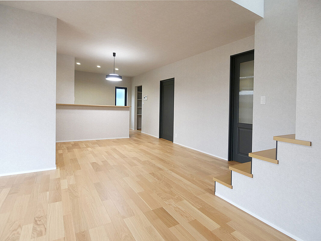 家族が集いやすい広々19.5帖のLDK。水廻りをまとめて家事をしながらも家族に目が届く配置と、リビング階段で家族のコミュニケーションがとりやすい間取り!