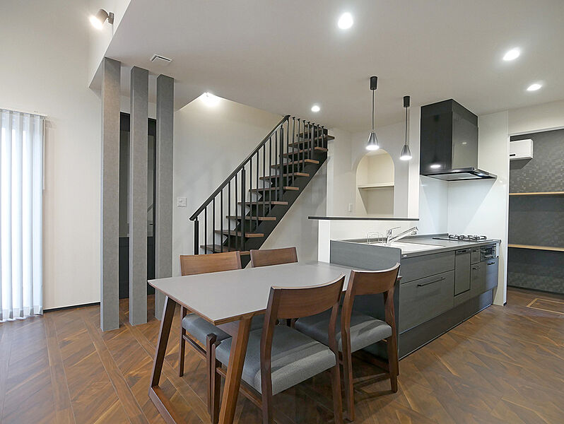 スケルトン階段と、リビング勾配天井で開放感あるLDKは約19帖で家族がゆったり集えるお洒落で落ち着いた印象。床暖房つきで足元あったかもうれしいポイント!
