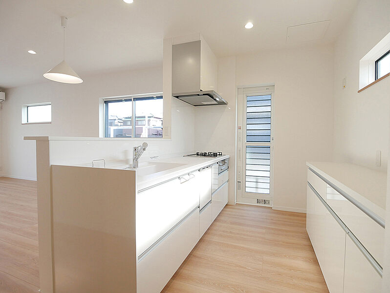玄関横に設けたシューズクローゼット&ファミリークローゼットで外出前の身支度や帰宅時片づけなどがスムーズ!LDKは2wayで、脱衣室を介して回遊できる家事ラク&生活動線スムーズな間取り!床暖房付き!