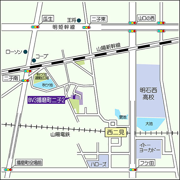 山陽電鉄本線「西二見」駅 徒歩5分~6分 JR山陽本線「土山」駅 1800m。自転車利用約9分 山陽電鉄本線「播磨町」駅 1170m。自転車利用約6分 |