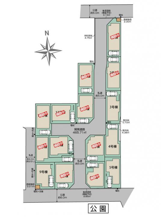 | 駐車場 | 1台 | 道路の幅員 | 分譲地内5. 0m私道(開発道路)、南6. 0m公道、北6. 0m公道 |