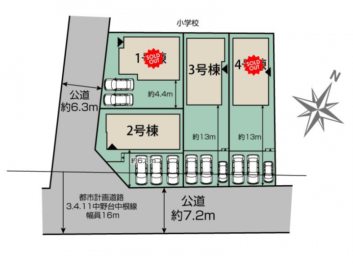 | 駐車場 | 3台 | 道路の幅員 | 南7.2m公道、西6.3m公道 |