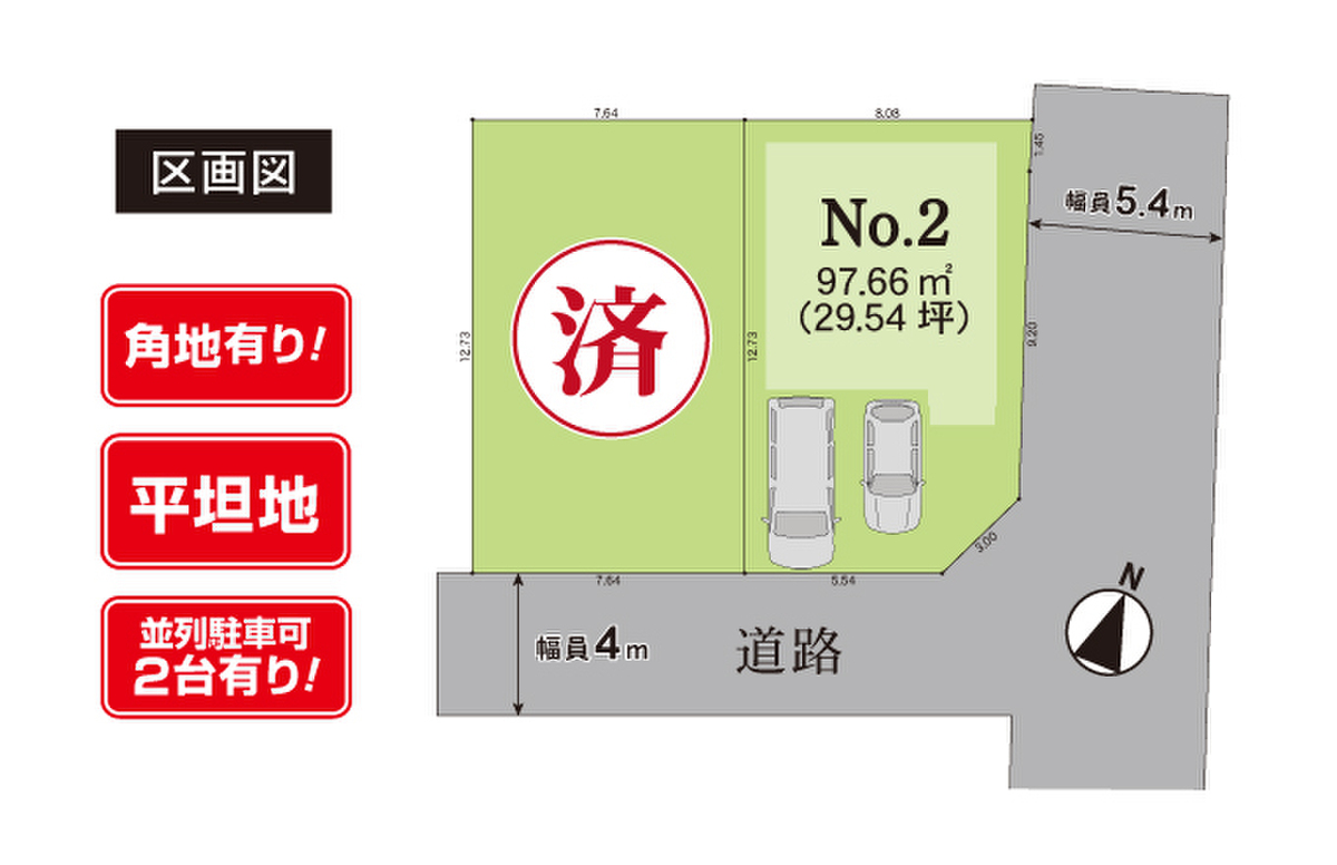 | 駐車場 | 1台 ~ 2台(カースペース2台) | 道路の幅員 | 東側5.4m、南側4m |