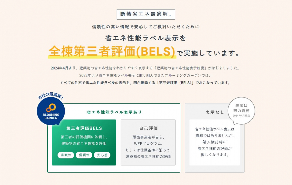 東栄住宅では、信頼性の高い情報で安心してご検討いただくために、全棟で省エネ性能ラベルの表示を、国が推奨する「第三者評価機関(BELS)」で行っています。
