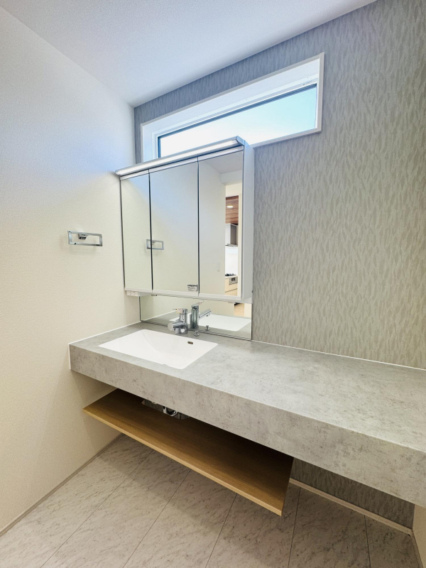 ■洗面台が広く、開放感がある洗面所・オープンサニタリーirodori。三面鏡の内側はコンセント付きの収納スペース。スタイリッシュな外観に加え、傷つきにくく汚れがつきにくい素材を使用した洗面台は、お手入れもラクラクです。