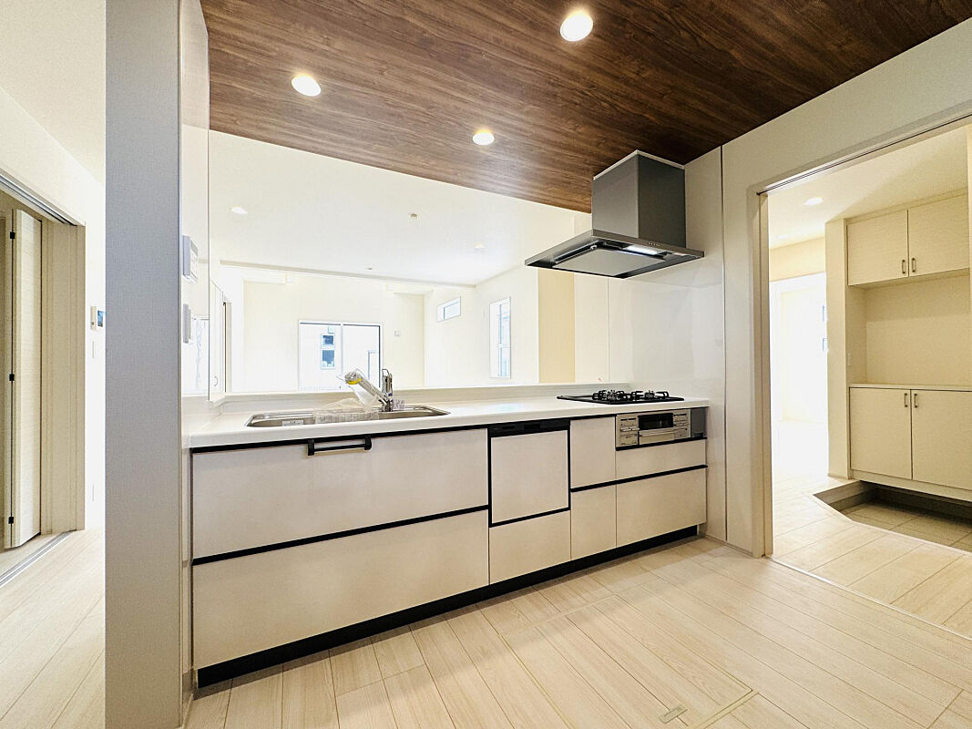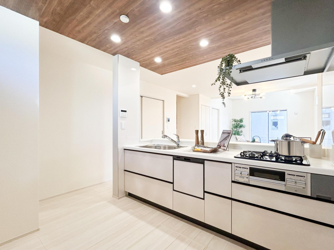 ■キッチンは、食洗器をはじめ、浄水器一体型水栓・三口コンロなどの機能が配備されています。2リットルのペットボトルが入る深さの床下収納付き。