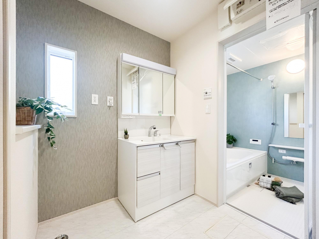 ■収納力に優れた3面鏡化粧台は、節水に効果的なエコカチット水栓。三面鏡の裏にはコンセント付き収納スペース!床下収納付き。