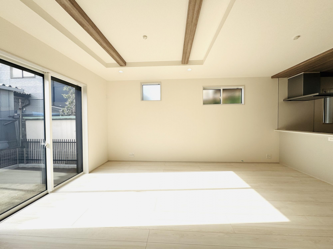 南側のお庭から光が注ぐ明るい16.0畳のリビングです。