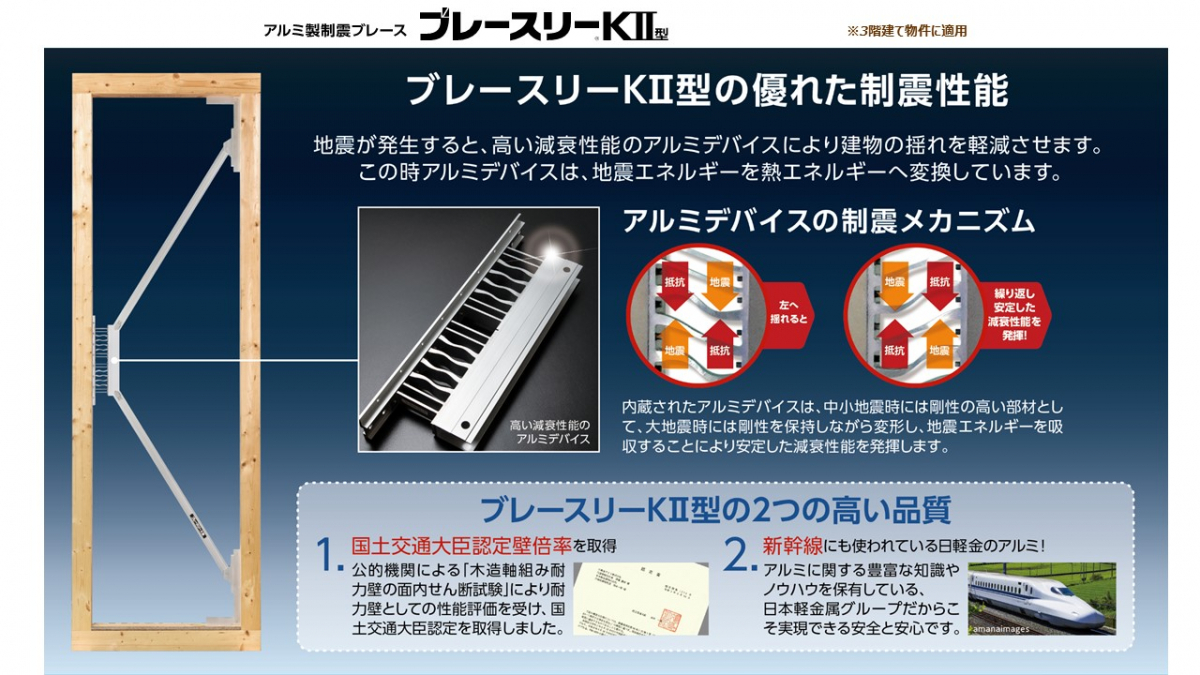 耐震技術に加え「+制震」という揺れを抑える技術「東栄セーフティ―ダンパー」を、東栄を含む三社で共同開発。3階建には「ブレースリーK2型」を装備しています。