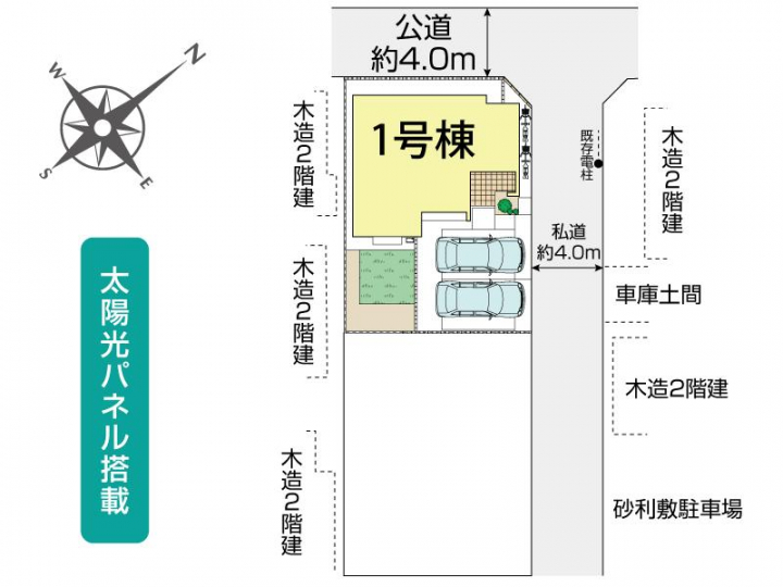 | 駐車場 | 2台 | 道路の幅員 | 北西4.0m公道、北東4.0m私道 |