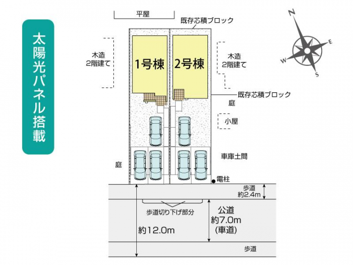 【接道】南12.0m公道 【設備】公営水道、東京電力、個別プロパンガス、本下水 【その他法令】宅地造成及び特定盛土等規制法、特定都市河川浸水被害対策法 【備考】太陽光発電システムについてはリース契約になります。リース契約期間は10年間、毎月利用料金は【1号棟:8,481円(税込)、2号棟:8,481円(税込)】がかかります。期間終了後は無償譲渡されます。※詳細は営業担当にお問い合わせください。 |