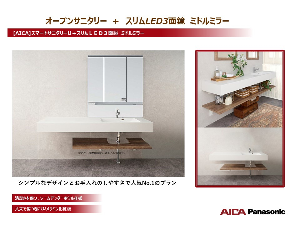 ■洗面台が広く、開放感がある洗面所・オープンサニタリーirodori。三面鏡の内側はコンセント付きの収納スペース。スタイリッシュな外観に加え、お手入れもラクラクです。