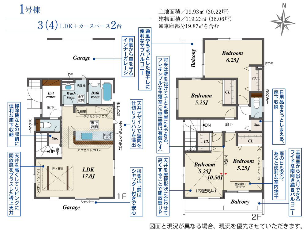 | 建物面積 | 119.23m2(約36.06坪) | 土地面積 | 99.93m2(約30.22坪) |