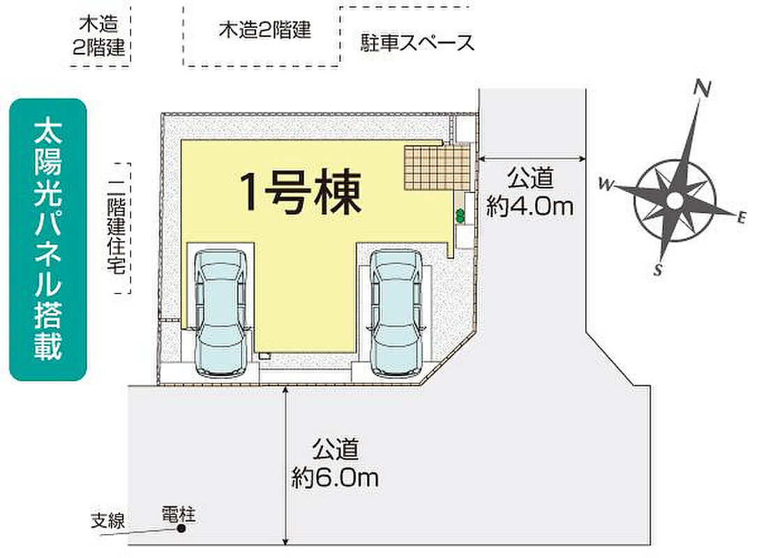 【接道】南6.0m公道、東4.0m公道 【設備】公営水道、東京電力、都市ガス、本下水 ※太陽光発電は、月額サービス料0円でご利用いただけるプランです。サービス期間(10年間)中の売電収入は東京ガスに帰属します。契約満了後は売電収入も含め、引き続きお客様にご利用いただけます。 |