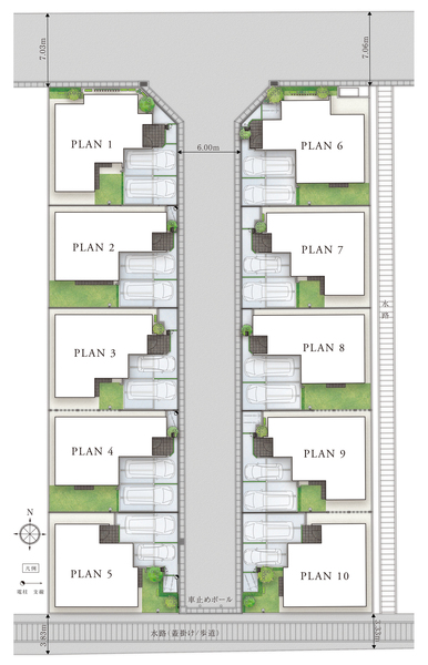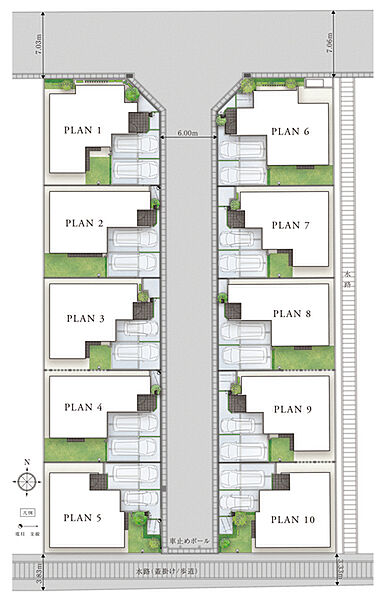 ・ワンエントランスで住民以外が利用しにくく安心の街区内道路。全10邸。カースペース2台分とサイクルスペースを全邸確保(駐車可能な車種に制限あり)