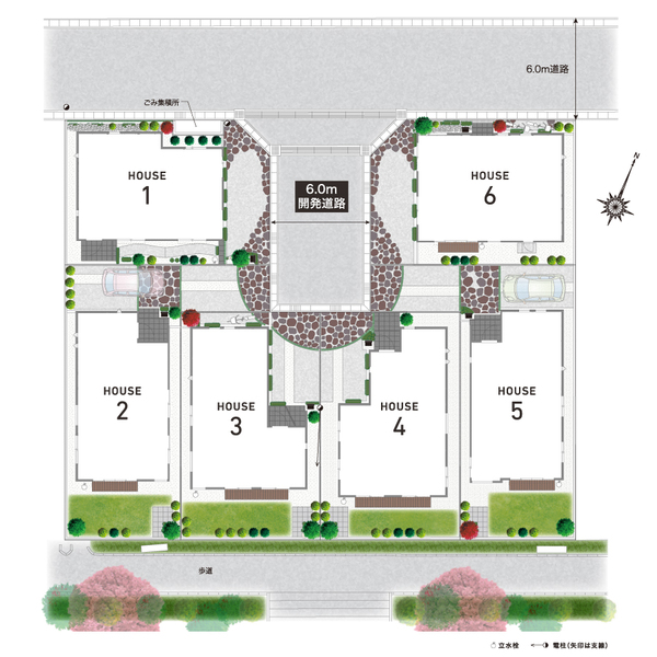 開放的な6.0mの広がりを持つ開発道路。車の通り抜けがなく緑の...