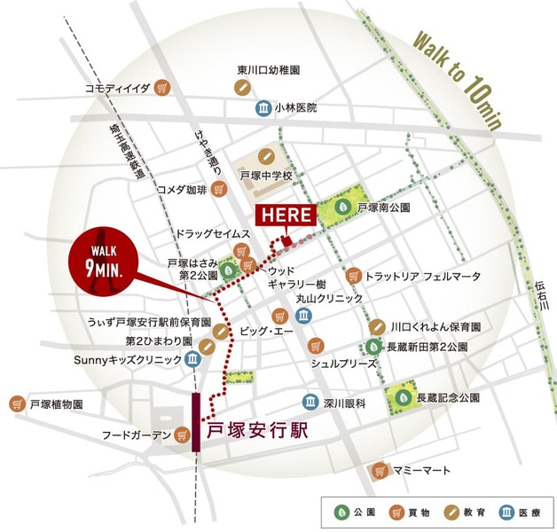 - ※物件から周辺のお店・施設までの距離は、利用が想定される道路を通行した場合の距離です。なお、必ずしも最短距離を保証するものではありません。