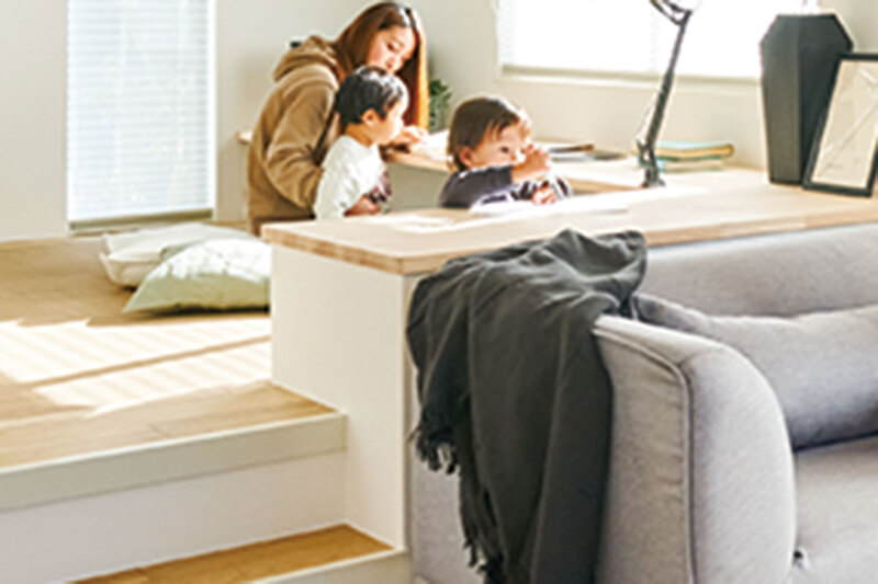 シックハウスの原因となる空気中に漂う有害物質を吸着し、低減してくれる壁材をリビング壁の一部に施しました。室内の湿度を一定に保とうとする吸放湿特性にも優れています。