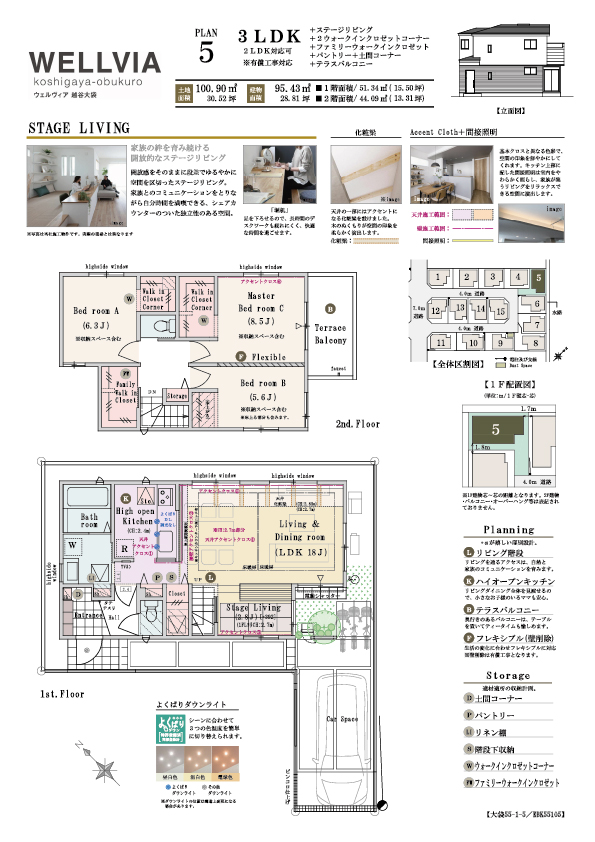 - 3LDK(2LDK対応可※有償工事)+ステージリビング+2ウォークインクロゼットコーナー+ファミリーウォークインクロゼット+パントリー+土間コーナー+テラスバルコニー ~ 5LDK(4LDK対応可※有償工事)+ウォークインクロゼットコーナー+パントリー+土間コーナー+テラスバルコニー