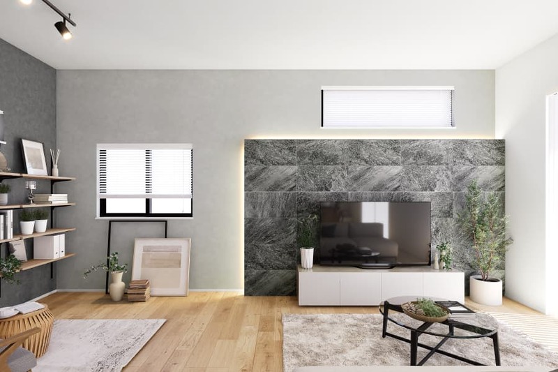 TV背面にエコカラットプラスと間接照明を組み合わせたアクセント...