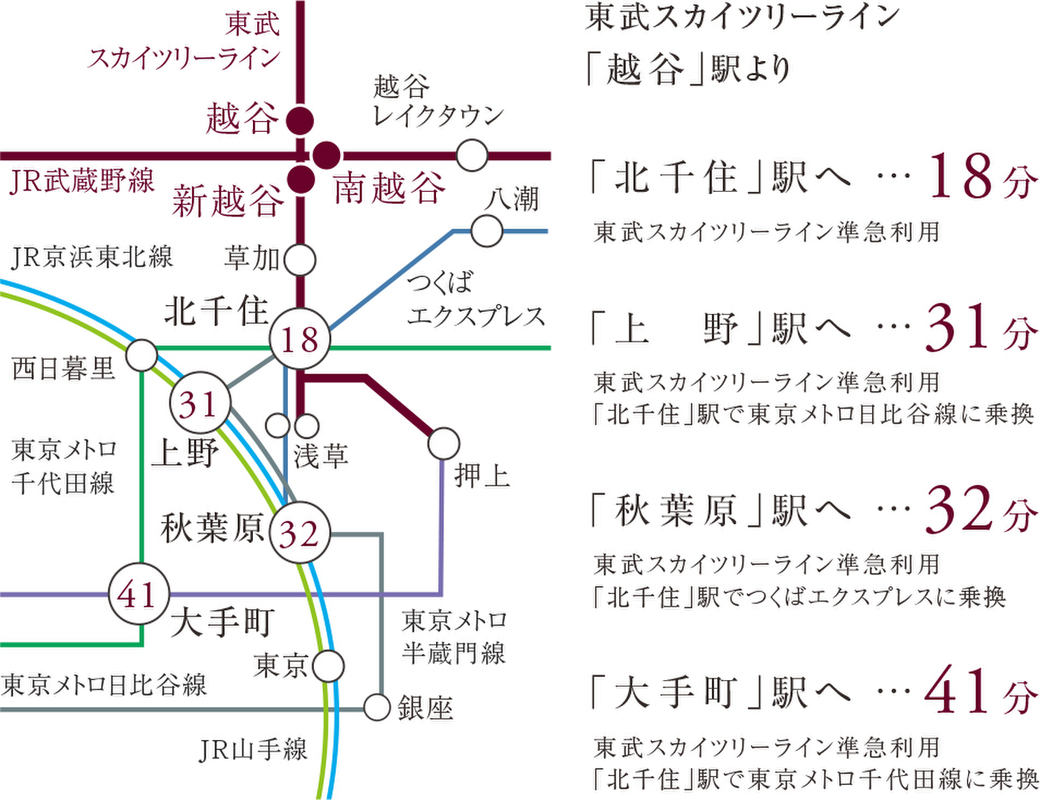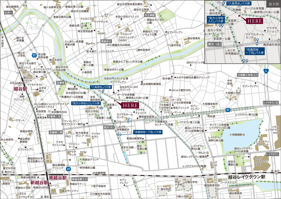 - 東武伊勢崎線「越谷」駅 バス12分 八条用水バス停 徒歩3分JR武蔵野線「南越谷」駅 バス10分 西方小学校入口バス停 徒歩5分JR武蔵野線「越谷レイクタウン」駅 バス17分 八条用水バス停 徒歩3分