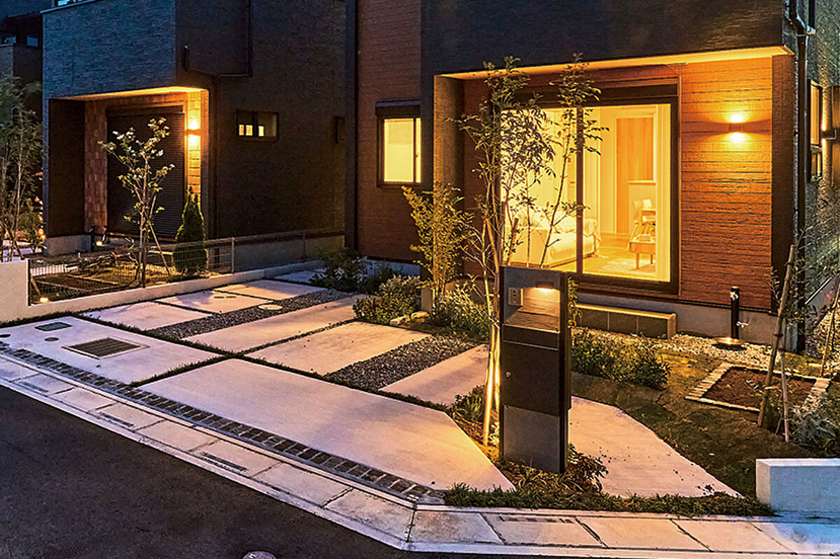 ◆南道路を活かした建物配置で陽当たりを確保。石積調、木目調の外壁デザインで緑道と調和。