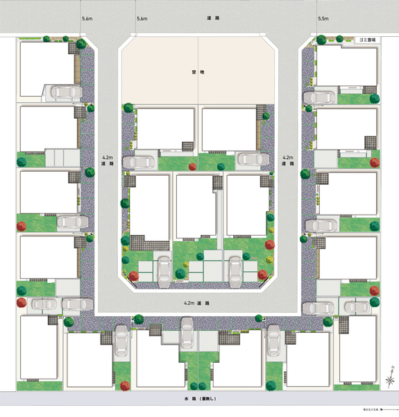 ◆分譲地内前面道路にコミュニティ拠点(AMU)を計画。街と人をつなぐ「オモニワ」、プライベートな「ウラニワ」のある街