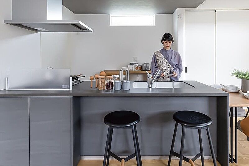 壁のない対面式キッチンは、開放感があり料理しながらリビングにい...