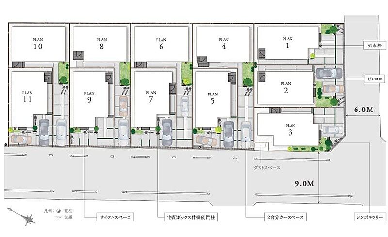 各邸に潤いをもたらすシンボルツリーや品格あるピンコロをカースペースの一部に施し、上品な街並風景をデザインしました。