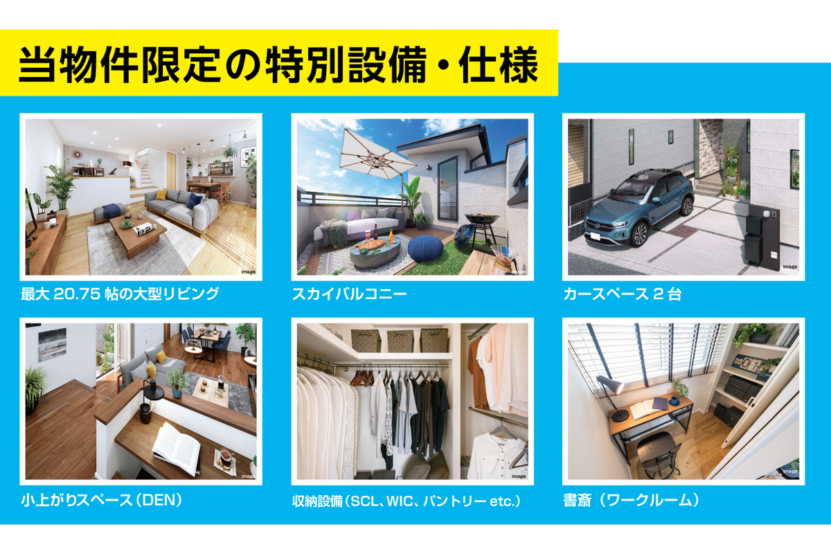 - ※完成予想図やCG合成画像は、門塀・植栽・庭・外観等、実際とは多少異なる場合があります。