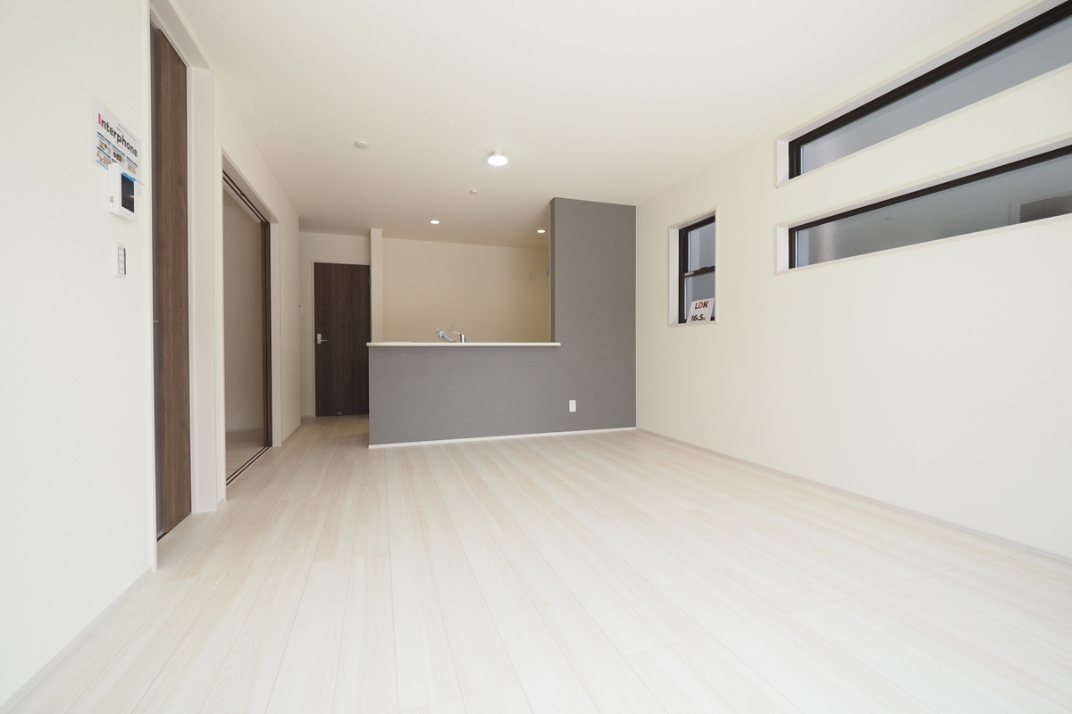 開放感ある16.5帖LDKとオープンキッチンで快適な居心地。家庭の会話が弾む空間を提供。
