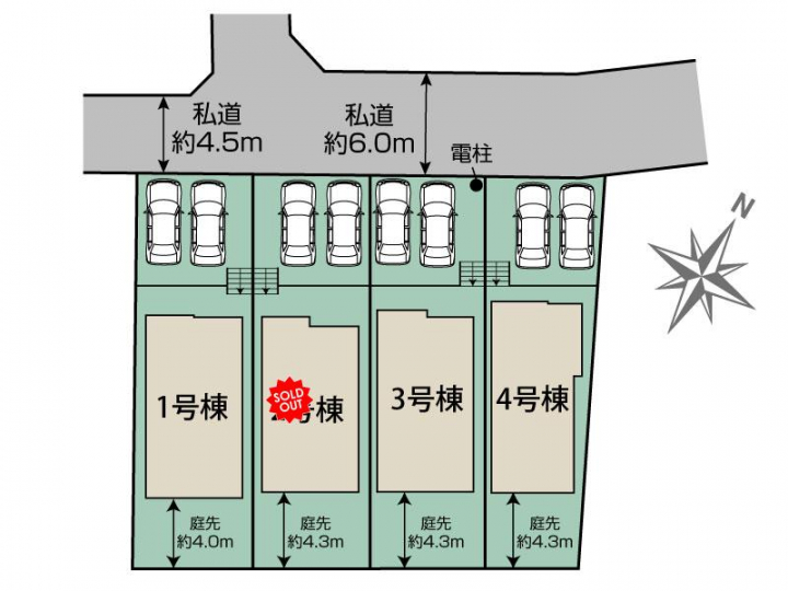 | 駐車場 | 2台 | 道路の幅員 | 北西 4.5m私道、北西 6.0m私道 |